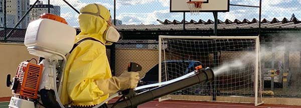 Desinfecção com sistema de Nebulização e outros recursos de aspersão (pulverização), tratando a atmosfera do ambiente e todas as superfícies, incluindo aquelas de difícil acesso para sanitização manual.